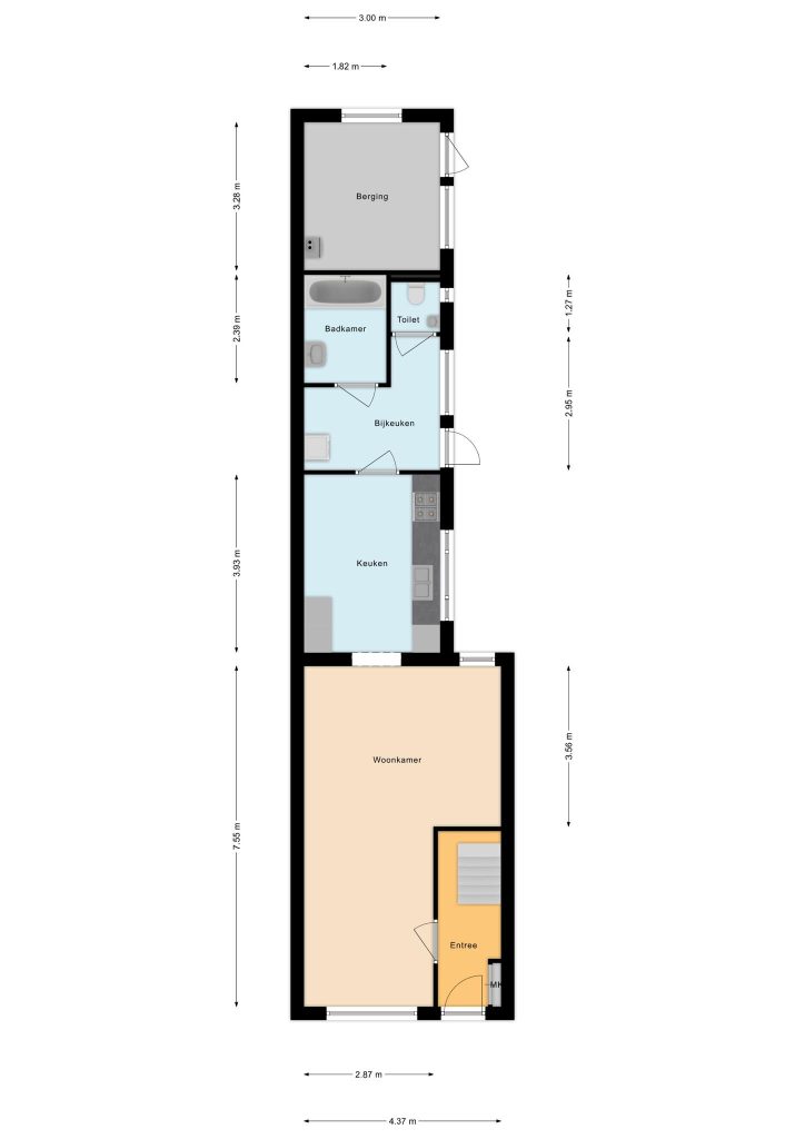 Achter de opvallende gele voordeur vinden we de entree met de garderobe, gastentoilet met fonteintje, trapopgang naar de eerste verdieping en toegang tot de voorkamer/woonkamer.