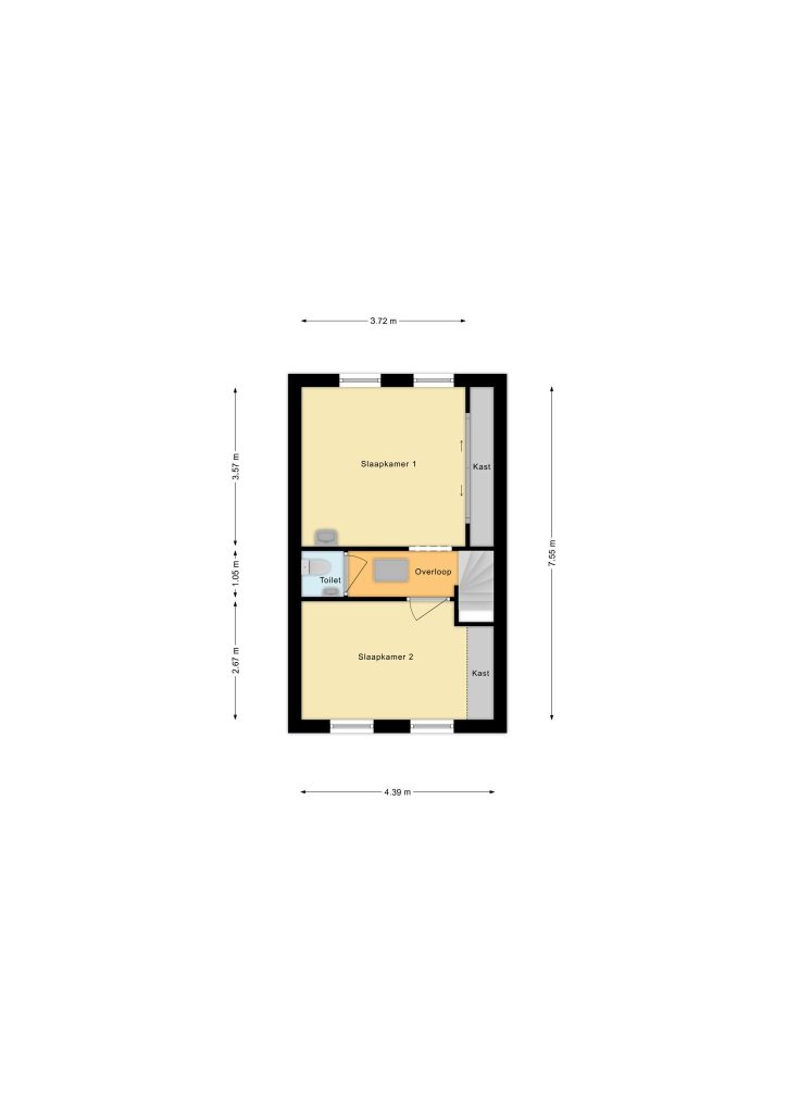 Via de trap in de hal bereiken we de overloop van de eerste verdieping. Op deze verdieping vinden we de 2 slaapkamers en een separaat toilet met fonteintje.